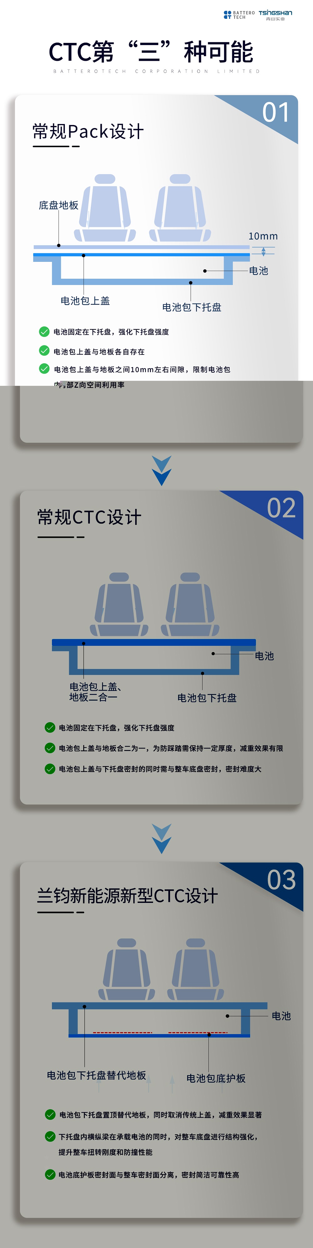 对此,兰钧新能源以科技创新、强化降本增效的思维,创造性推出第“三”种新型CTC车电集成路线,即“蝙蝠侠电池方案”。