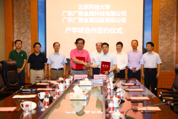 7月5日,广东广青金属科技有限公司、广东广青金属压延有限公司与北京科技大学产学研合作及党组织共建签约仪式在北京科技大学举行。北科大校长杨仁树,科研院、工研院等主要负责人,阳江市科技局局长谭坚华,广青科技、广青压延党委书记、董事长王磊,党委副书记、监事长江华革,副总经理江潇及副总工程师田伟光等领导参加了签约仪式。
