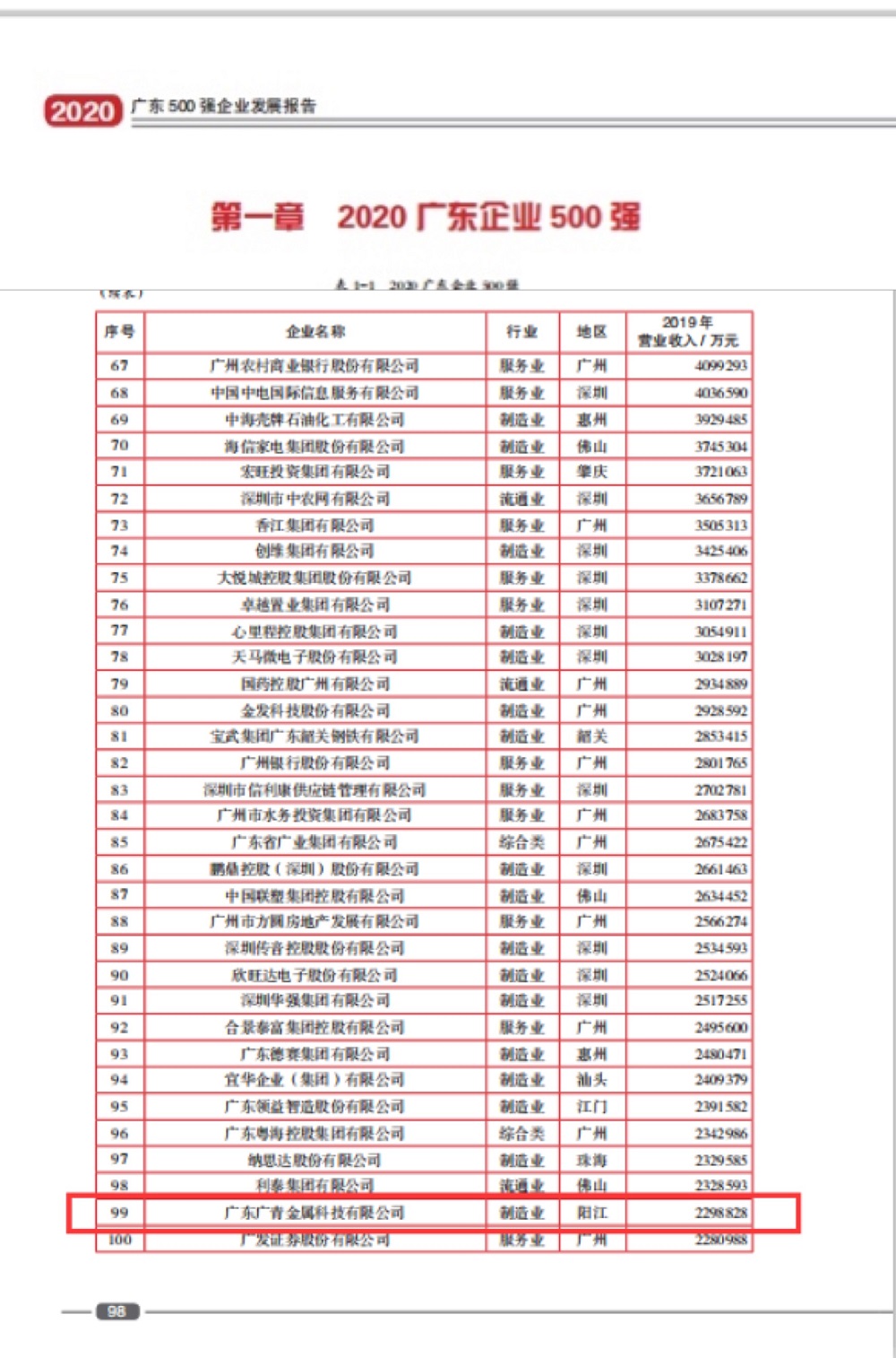 广青科技位列2020年广东企业500强第99位