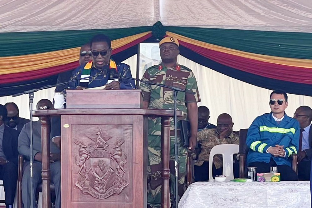 3月22日,津巴布韦总统姆南加古瓦携副总统齐温加、矿业部长苏达等到访鼎森钢铁(私人)有限公司项目现场,与鼎森钢铁董事长许克敏及公司高管进行了亲切会谈,并向中津两国全体员工发表了主旨演讲。